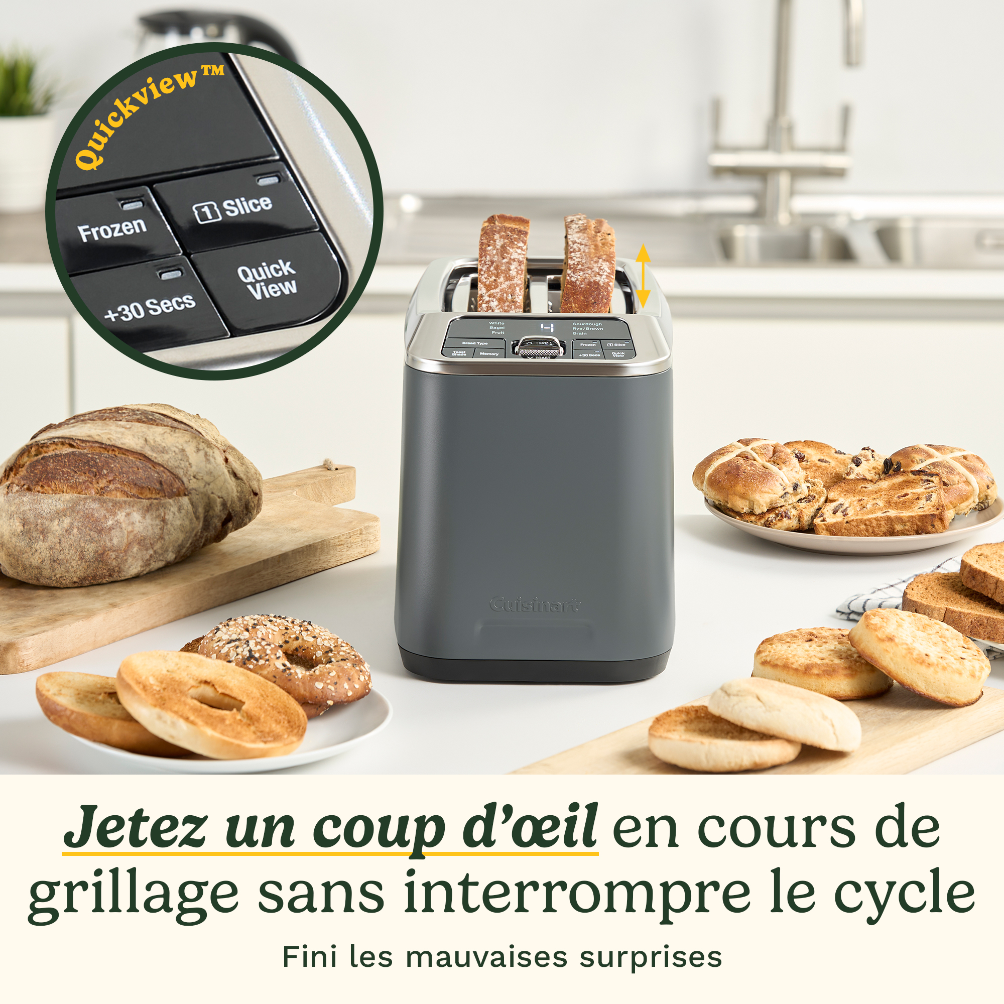 - High-Lift QuickView™ + 30 secondes pour un contrôle précis: Jetez un coup d’œil à votre toast en cours sans interrompre le cycle, et ajoutez 30 secondes pour une finition dorée parfaite – parce que parfois, vous savez qu’il en faut juste un peu plus.